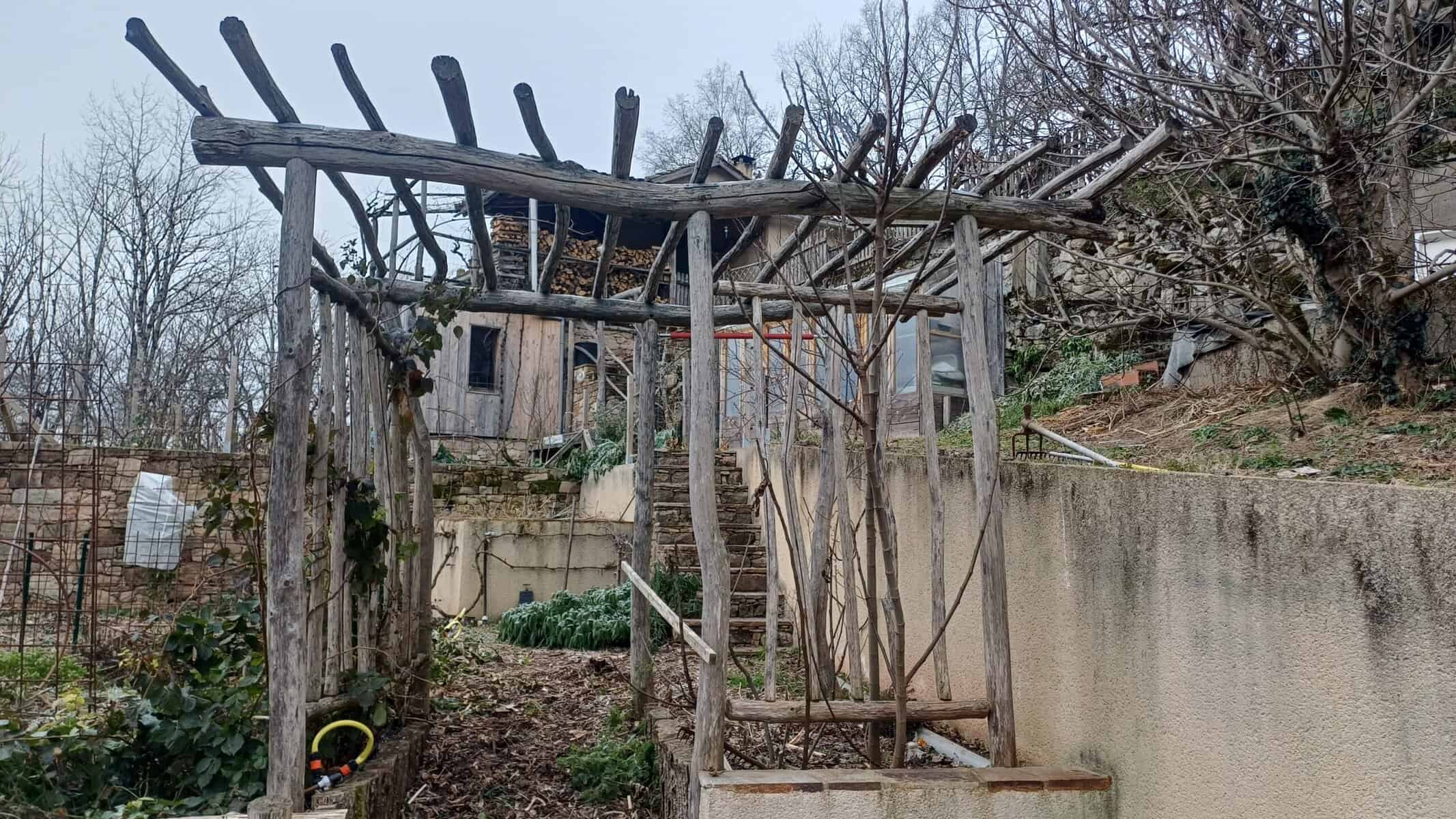 En 2021, j’ai construit cette pergola avec du châtaignier sec prélevé sur mes parcelles forestières en Aveyron. Coût matériau : 0€. Temps de construction : 2 jours seul avec un outillage basique.